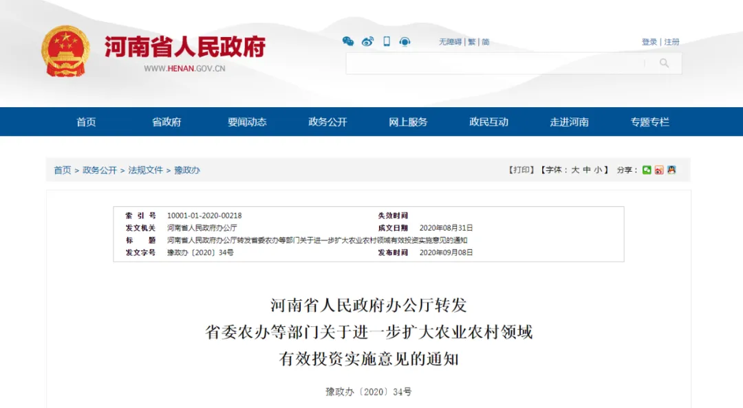 省委农办等部门制定的《关于进一步扩大农业农村领域有效投资的实施意见》已经省政府同意,现转发给你们,请认真贯彻落实。 为贯彻落实国家决策部署,扩大农业农村有效投资、加快补上“三农”领域突出短板,进一步巩固农业基础地位、打赢脱贫攻坚战、实现乡村振兴,提出如下意见。 以习近平新时代中国特色社会主义思想为指导,聚焦乡村振兴重点领域,围绕“产品质量高、产业效益高、生产效率高、经营者素质高、市场竞争力高、农民收入高”发展目标和“布局区域化、生产标准化、经营规模化、发展产业化、方式绿色化、产品品牌化”发展方向,扩大地方政府债券用于农业农村的规模,推动财政支农投入稳定增长,深入推进金融支农,有效引导社会资本投入,进一步扩大全省农业农村领域有效投资,推动农业高质量发展和乡村振兴。 (一)高标准农田建设工程。重点在永久基本农田保护区、粮食生产功能区和重要农产品生产保护区实施整治田块、建设灌排设施、整修田间道路等工程,支持丘陵山区农田宜机化改造,提高建设质量,确保2020年建设660万亩、到2025年建成8000万亩集中连片、旱涝保收、节水高效、稳产高产、生态友好的高标准农田。 (二)农产品仓储保鲜冷链物流设施建设工程。加快建设郑州国家骨干冷链物流基地,支持建设一批冷链物流示范园区。在蔬菜、水果、畜产品、水产品等鲜活农产品主产区和特色农产品优势区重点建设一批分拣包装、冷藏保鲜、仓储运输、初加工等设施,大幅度提升果蔬预冷和肉类、水产品冷藏保鲜能力以及冷链流通率,减少产后损失,保障产品品质。 (三)现代农业园区建设工程。建设现代农业产业园、产业融合示范园,加强国家农业高新技术产业示范区、国家农业科技园区建设,推进农业产业强镇、优势特色产业集群建设。加强现代农业生产性服务设施建设。加快推进国家生物育种产业创新中心、国家农机装备创新中心等重要创新平台建设,规划建设国家级小麦种质资源库,加强农业重大科技创新能力条件建设。 (四)动植物保护建设工程。强化动物疫病、农作物病虫害监测预警设施、应急防控和物资储备等工程建设。支持陆生动物疫病病原学监测区域中心、县级动物疫病预防控制中心、乡镇畜牧兽医站、动物卫生监督检查站、病死畜禽无害化收集处理场,全国农作物病虫疫情监测中心(省级)田间监测项目、病虫疫情应急防控设施及物资储备库项目、天敌微生物等绿色防控产品生产繁育基地项目、迁飞性害虫雷达监测站项目、区域农药风险监测试验站,省级水生动物疫病监控中心、水生动物疫病防控监测区域中心建设。 (五)农村人居环境整治工程。分类推进农村厕所革命,有序实施农村户用厕所无害化改造,2020年改造无害化卫生厕所150万户,全省卫生厕所普及率达到85%。全面推进农村生活垃圾治理,因地制宜建设资源化处理设施。梯次推进农村生活污水治理,开展农村黑臭水体治理,建设一批工程设施。加快推进农作物秸秆、畜禽粪污资源化利用设施建设。开展村庄清洁和绿化行动,推进“美丽家园”建设。 (六)农村供水保障工程。因地制宜在人口相对集中的地方推进规模化供水工程建设,有条件的地方试点建设城市管网向农村延伸工程。具备条件的地方要将集中式地下水型饮用水水源置换为地表水,2022年年底前基本完成2个省辖市、21个县(市、区)饮用水地表化试点建设任务。2020年实施15处大型灌区续建配套与节水改造工程和23处中型灌区节水配套改造工程。“十四五”期间,实施大中型灌区续建配套现代化改造工程。 (七)乡镇污水处理工程。优先在人口密度规模比较大的乡镇所在地村庄,重点建设一批污水处理厂和配套管网等设施,提高乡镇污水处理水平,力争2020年所有乡镇政府所在地村庄生活污水得到治理或管控。到2020年底,全省农村生活污水处理率达到30%左右,农村生活污水乱排乱放得到有效管控;2021年至2025年,全省农村生活污水治理率逐年提升,2025年达到45%以上。 (八)智慧农业和数字乡村建设工程。加快农业农村大数据工程建设,持续巩固全省13.7万个20户以上自然村通4G和通光纤成果,加快实现农村固定宽带用户百兆接入全覆盖,推进农业物联网、大数据、区块链、人工智能、5G等新型基础设施建设和现代信息技术应用,大力发展农业农村数字经济,构建乡村数字治理体系。 (九)农村公路建设工程。以交通强国试点建设为抓手,推动“四好农村路”示范创建提质扩面。大力实施农村公路“百县通村入组工程”,2020年完成1.5万个20户以上自然村通硬化路任务,到2021年年底基本实现全省20户以上自然村通硬化路。 (十)农村电网建设工程。持续推进农村电网改造升级,2020年完成660万亩高标准农田新增机井配套10千伏高压供电设施建设和3000个配电台区改造升级,提升农村电网安全可靠供电能力;做好2020年全省98.22万“电代煤”用户配套电网改造工作,保障百姓冬季清洁取暖的用电需要;推进“电代煤”烟叶烤房配套电网改造。“十四五”期间,加快补齐农村电网基础设施短板,满足农业灌溉、清洁取暖、乡村产业发展等需要。 (一)充分发挥规划的引领作用。围绕农业高质量发展,聚集“三农”领域突出短板,结合“十四五”规划编制,突出畜牧业、农业机械化、粮食生产核心区、农业信息化